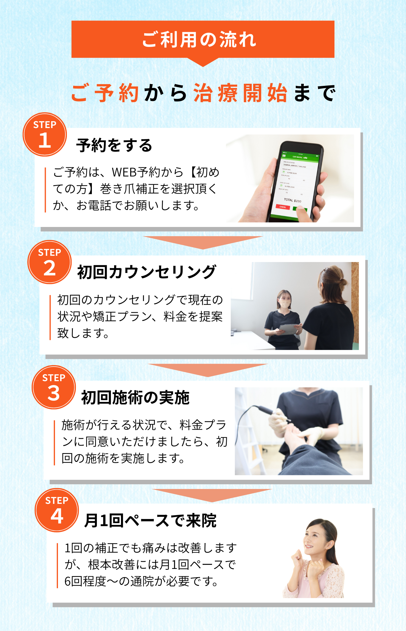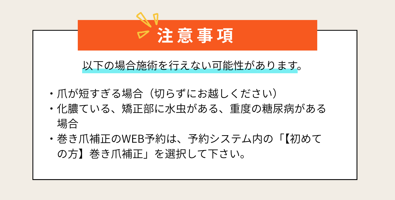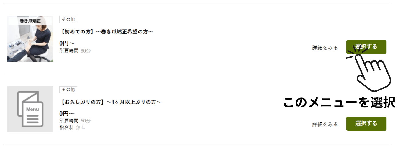 WEB予約サイトから下記の【初めての方】~巻き爪補正希望の方~を選択して下さい。